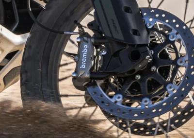 Na předním i zadním kole je osazen kompletní brzdový systém Brembo (třmeny, brzdová pumpa). Vpředu dva kotouče o průměru 320mm. Vzadu jeden kotouč o průměru 260mm.
